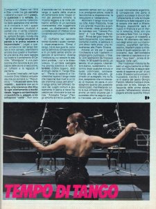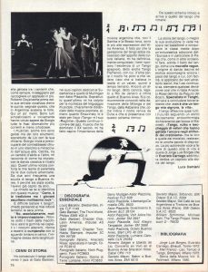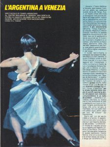 Il primo articolo qui riportato uscì sul settimanale musicale «Ciao 2001» dell’8 aprile 1984, alle pagine 72-74; le immagini che lo accompagnano ne sono la riproduzione. La foto in alto è tratta dallo spettacolo “Tango Argentino” tenutosi a Parigi durante l’edizione del 1989 del Festival d’Automne; per saperne di più, qui. Il secondo pezzo uscì su «Ciao 2001» del 31 maggio 1985; la foto che lo procede è tratta da un video su YouTube.